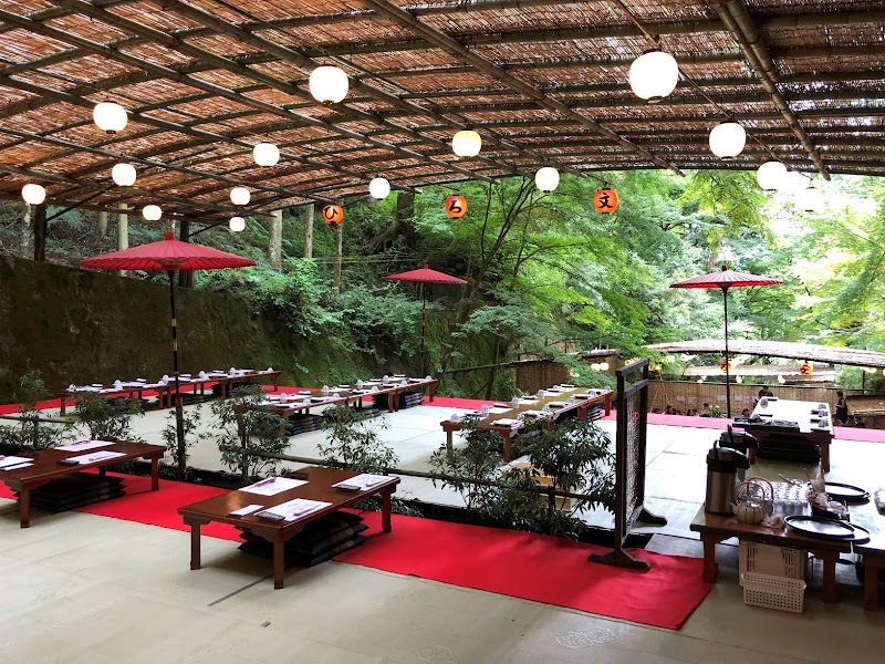 기부네의 여름 나가시소멘(흐르는 소면) 명점. 대나무 홈통을 타고 흐르는 소면을 젓가락으로 잡아먹음