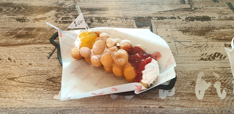 동글동글 와플에 생크림이 듬뿍 올라간 디저트로 유명한 통영 카페. 딸기, 유자 등 다양한 맛을 즐길 수 있다.