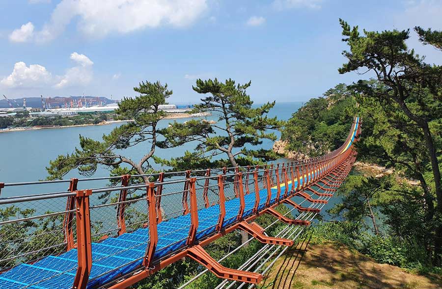 대왕암공원의 303m 출렁다리에 야간 조명이 켜지면 푸른 바다와 대비되는 환상적인 야경을 감상할 수 있다.