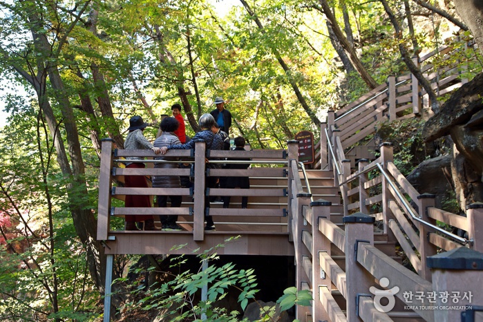 한탄강 지질공원 내 현무암 주상절리 폭포. 에메랄드빛 물과 기둥 모양 바위가 이국적인 분위기를 자아낸다.