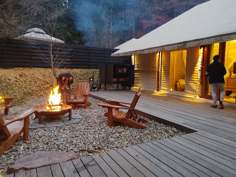 아키가와 계곡의 최고급 글램핑. 넓은 부지에 텐트 2동만 배치한 완전 프라이빗 공간. 자쿠지 완비.