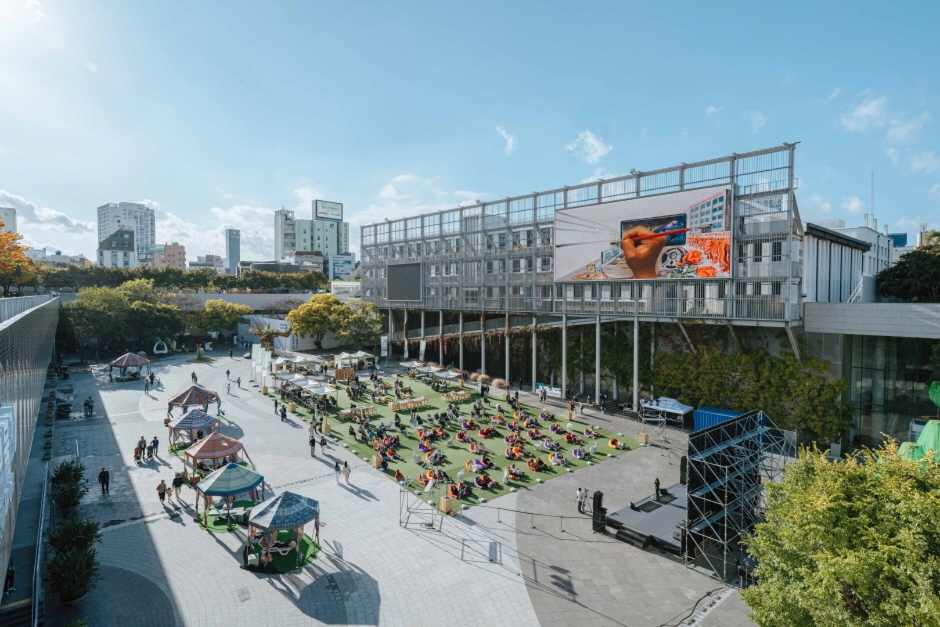 국립아시아문화전당 지상 잔디광장. 우산 포토존이 유명하며 피크닉 명소로도 인기.