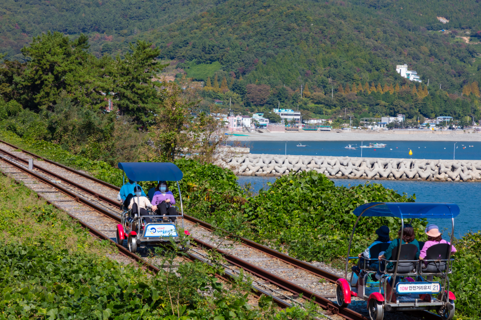 여수 해안을 따라 달리는 레일바이크로, 터널 조명과 바다 풍경을 동시에 즐길 수 있는 인기 액티비티이다.