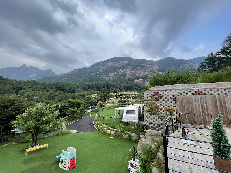 산정호수 인근의 글램핑 및 카라반 캠핑장. 잔디밭과 계곡, 바위 절경이 어우러져 있으며, 가족형 시설이 잘 갖춰져 있다.