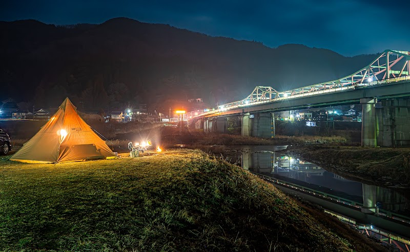 기즈가와 강변의 인기 캠프장. 예약 불필요, 자유로운 프리사이트. 카약, 카누 가능.