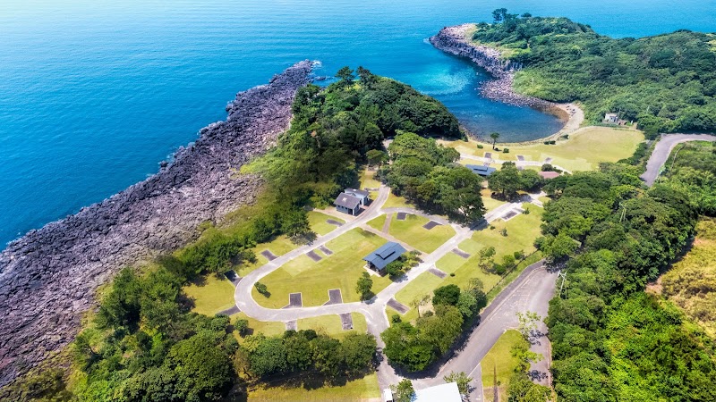 겐카이나다를 내려다보는 곶 위 캠프장. 해수욕장 인접, 야경으로 이카 낚시배 불빛 조망